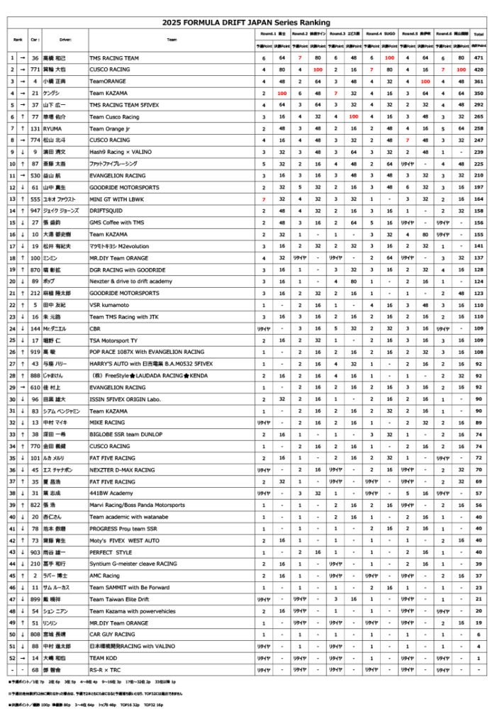 ん(GR86)。ラインをまとめた走りで78ポイントを獲得してトップに立つ。その後、田中友紀(JZX100)、ミンミン(GR86)も78ポイントを獲得するも、30番手でスタートした塙彰拡(Z4)が79ポイントで上回る。なかなか80ポイント以上が出なかったが、齋藤太吾(A90)、益山航(GR86)が80ポイント、松山北斗(A90)と草場佑介(GR86)が81ポイント、RYUMA(JZX100)が82ポイント、山中真生(A90)が83ポイント、山下広一(E92)が84ポイントと、上位陣が連続で80ポイント越えをマーク。