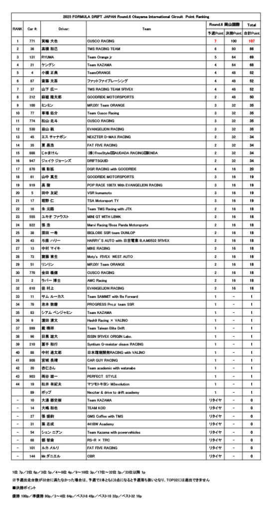 予選通過のボーダーラインは、72ポイント。1本目72ポイント、2本目に66ポイントを獲得した村上佳(GR86)が32位に滑り込み、予選通過を果たした。惜しかったのは、サムルーカス(S15)と池本数磨(JZX100)。72ポイントを獲得するももう1本で0ポイントとなり、無念の33位、34位で予選敗退となった。